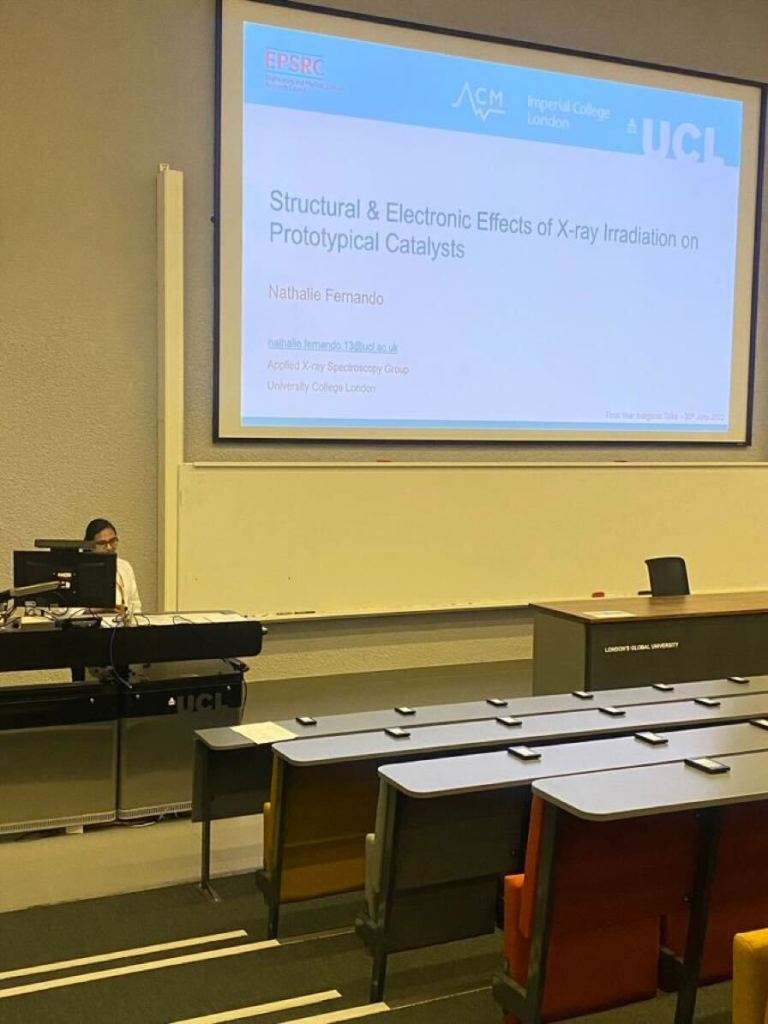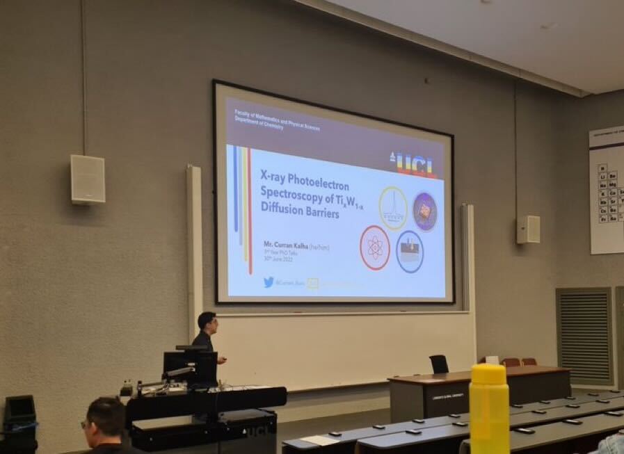 Nathalie and Curran both presented their projects as part of the departmental final year PhD talks in July. Nathalie shared her results on Structural & Electronic Effects of X-ray Irradiation on Prototypical Catalysts and Curran shared his work on X-ray Photoelectron Spectroscopy of TixW1-x Diffusion Barriers. Both talks received excellent feedback from our departmental community and Curran was named runner up for the Clarke Prize for the best talk in the inorganic chemistry section. Congratulations!