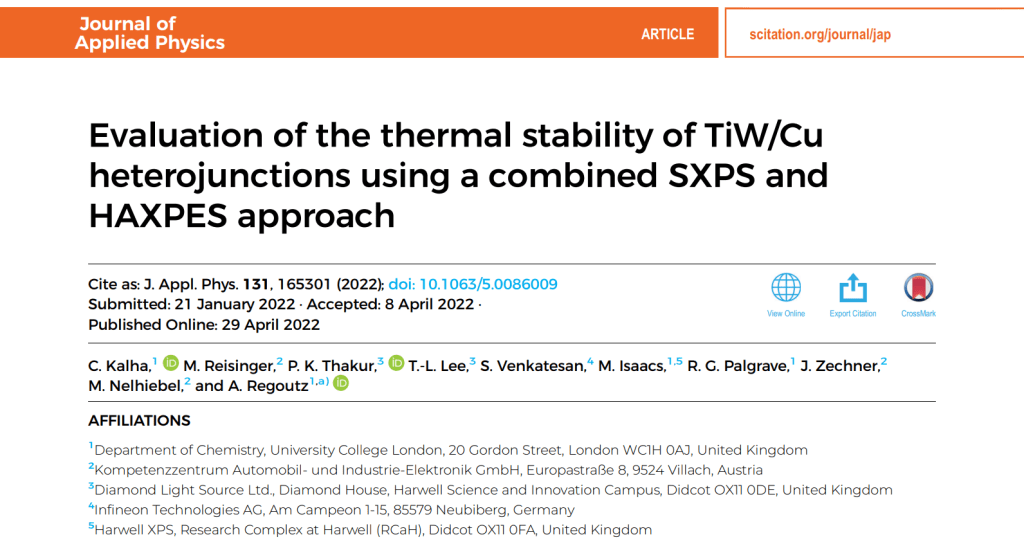 Hot off the press! Check out our latest collaboration with colleagues from Infineon Technologies Austria, KAI and HarwellXPS, exploring the interface stability of TiW/Cu heterojunctions using SXPS and HAXPES. This work marks the second publication in a series by Curran Kalha on TiW diffusion barriers and continues a long and fruitful collaboration with beamline I09 at the Diamond Light Source.