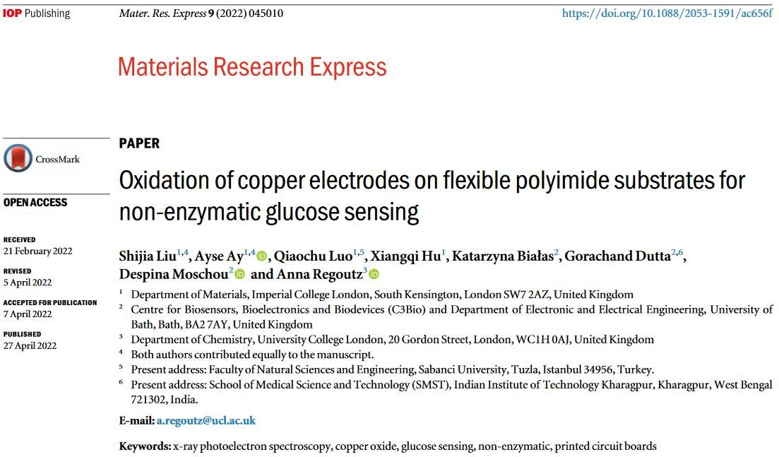 Integrating inorganic materials, that show great potential for sensing application, into platforms that are suitable for the industrial production of cheap, non-invasive sensors is of great importance for their broad implementation. In our recent open access paper in Materials Research Express, we show the successful integration of copper oxide based electrodes for glucose sensing on printed circuit board (PCB) technology. Together with collaborators at the University of Bath led by Dr Despina Moschou we could show that direct oxidation on PCB compatible substrates is possible and how production parameters including annealing duration and temperature influence the surface morphology and chemistry as well as influencing the resulting electrochemical sensing properties.